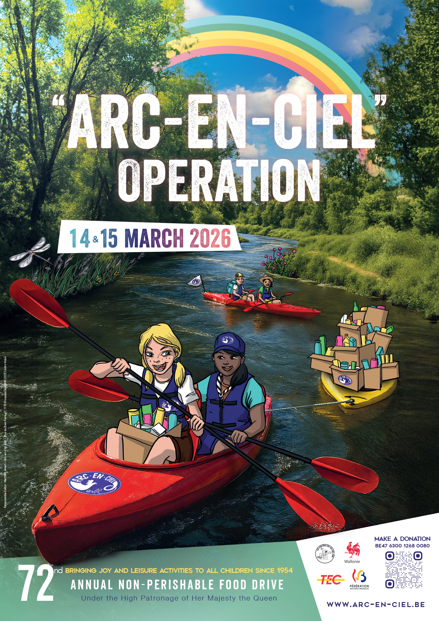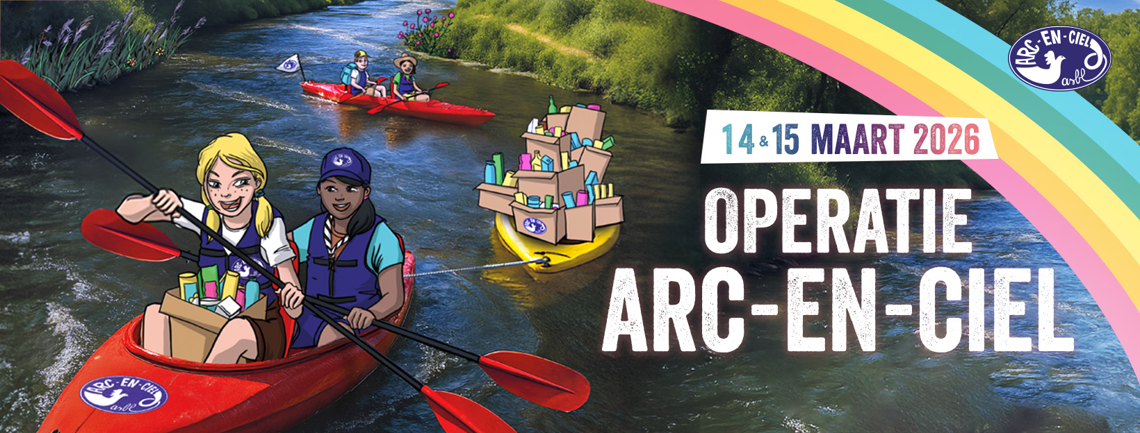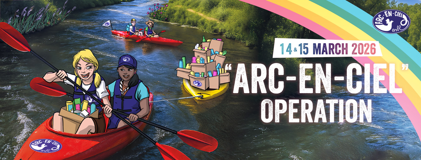 L’Opération Arc-en-Ciel est une grande récolte de vivres non périssables au bénéfice d’associations d’enfants défavorisés. Depuis 1954, chaque année, à la mi-mars, des milliers de jeunes bénévoles se mobilisent pour participer à cette récolte via le porte-à-porte, dans les écoles et à la sortie de grands magasins. En 2025, l’Opération s’est organisée le week-end des 15 et 16 mars. Et en 2026, l’Opération Arc-en-Ciel se tiendra le week-end des 14 et 15 mars !
